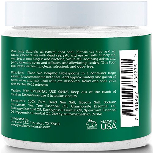 -. Feature : Fight Fungus with a Detox Foot Soak: Itching, swelling, and burning are just three of the signs that you're strling with a common fungal infection like athlete's foot. But fighting these uncomfortable and even embarrassing conditions is easier than you think! Our Foot Soak recipe boasts the anti-bacterial properties of powerhouse oils like Tea Tree and Peppermint. Together, they help reduce your symp and banish odor, leaving your feet happy and healthy. / Ease Foot Aches and Pains: From work, to the gym, and back home again, you depend on your feet to keep you moving. But overuse can leave you with aches, pains, and soreness. Thanks to ultra-soothing Epsom Salts and the relaxing scent of Chamomile Oil, our nourishingformula makes an incredible foot bath detox your feet will love! You can show your tired feet the TLC they crave while treating yourself to some in-home pampering after a long day. / Soften Corns and Remove Dead Skin from Feet: High heels and ill-fitting shoes are two of the leading offenders when it comes to corns and calluses. That thick, tough skin can cause discomfort when standing or wearing shoes - don't live your life in pain! Tea Tree Oil benefits the dead skin on feet by softening it and making it easier to remove, while Pure Dead Sea Salts offer a natural exfoliation that will have your feet feeling smooth in no time! / Spa Quality Ingredients: Who says you have to spend a fortune on a pedicure to have gorgeous feet? We loaded our therapeutic-grade Tea Tree Oil foot soaker with natural salts and essential oils like Rosemary and Spearmint to provide you with a luxurious, indulgent experience you won't need to leave home for! And because our formula leaves out chemicals and artificial additives, you don't have to worry about irritating or drying your skin. / Your Satisfaction Guaranteed: When it comes to effective beauty solutions, who can you trust more than your friends at Pure Body Naturals? We love our new Foot Soak salts so much that we want to give you our risk-free guarantee. Go ahead and try this incredible Foot Soak, and if you aren't completely wowed by the results, you can return it for a full refund - no questions asked. There's nothing to lose! When you shop with us, your feet are in good hands.