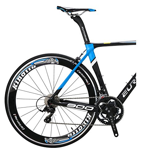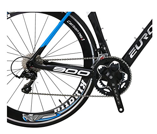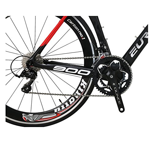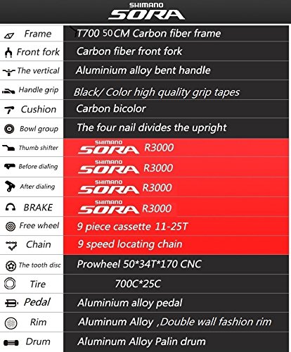 This 700C Carbon Fiber road bike is more fashion and light. Frame material : carbon Fork material : carbon Seat post material : carbon Frame height : 50 cm Wheel size: 700C Gear sets: 18 Speed Shimano SORA R3000