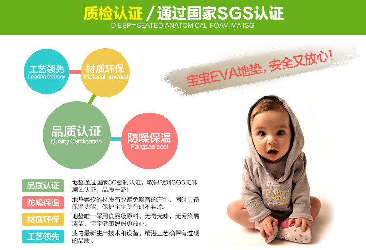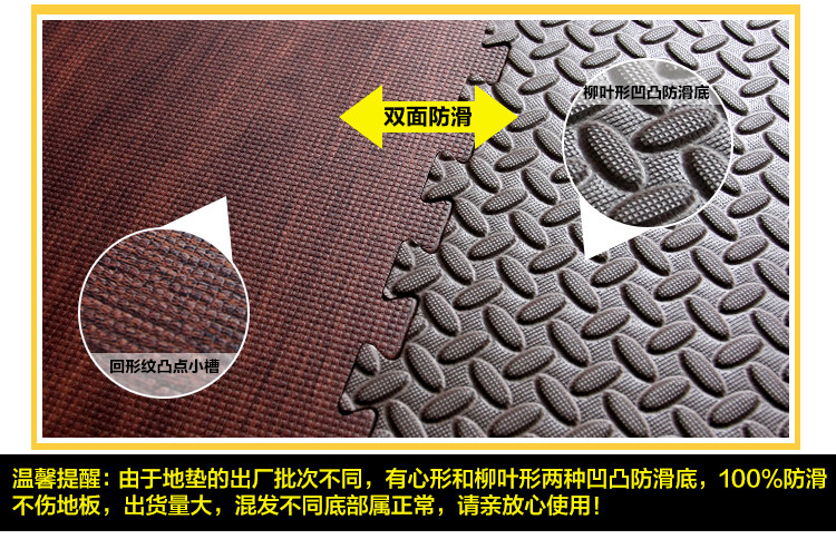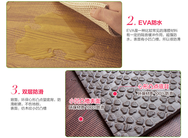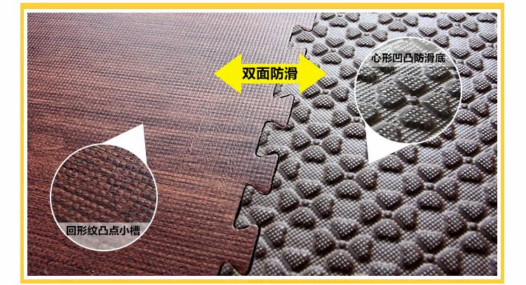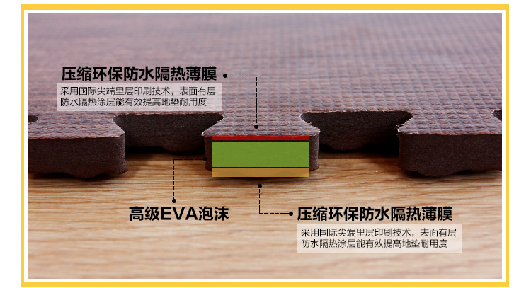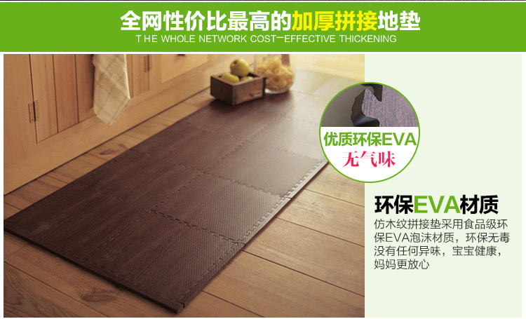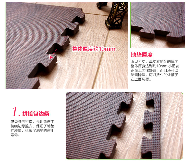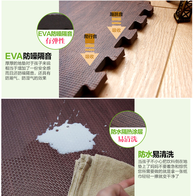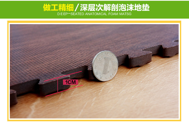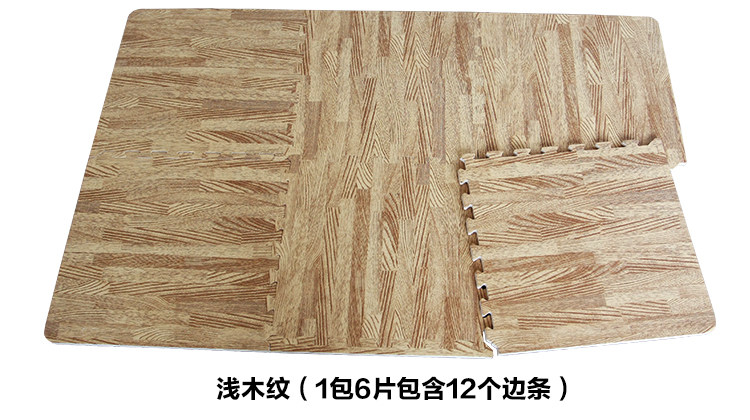 Product name Fabrics and materials Back Size Weight Thickness Color Washing method Reminder Summer?green waterproof?sound-absorbing insulation?foam?pad High quality food grade?environmental protection EVA?foam?material Double?slip,?positive:?FRET?bump?slot,?heart-shaped?opposite:?convex and concave anti-skid?bottom About 30*30cm/?chip?contains 6?pieces,?1 About 60G/?film,?about 360G/?package The overall thickness?of about 10mm Dark brown?wood?grain?small?denticles?/?shallow Camel Easy to clean,?dry?cloth?to scrub,?flat 1,?because of?personal display?brightness contrast?display differences,?pictures and objects?may have slight?color difference?is a normal phenomenon 2,?due to manual?measurement,?if 2-4cm?errors?are within reasonable limits |
