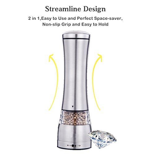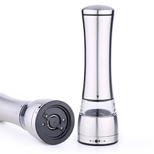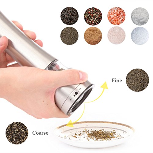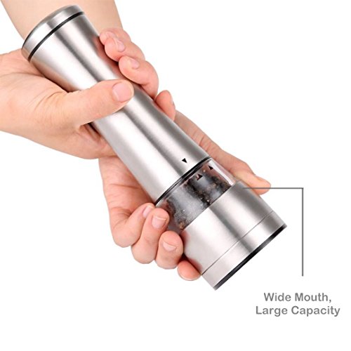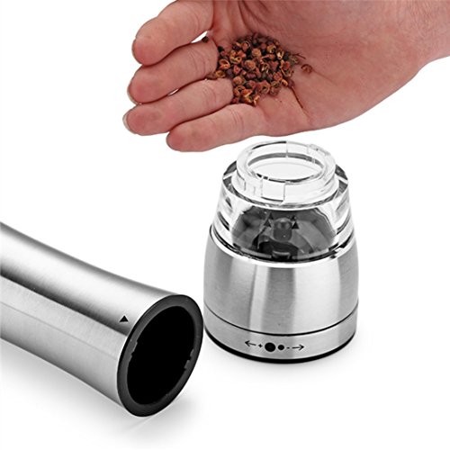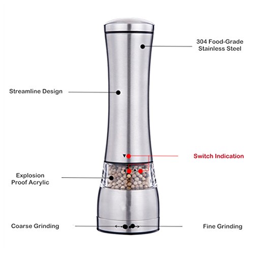 Material-Made of Food Grade Stainless Steel for the Housing and explosion proof acrylic plastic for internal, this salt and pepper grinder is of great durability and makes a perfect cooking aid for freshly ground spice