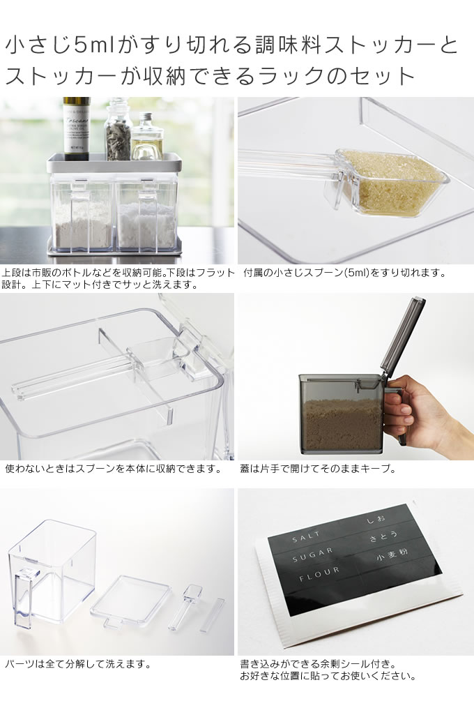 | ポイント | 小さじ5mlがすり切れる調味料ストッカー2個セット 上下にマット付きで汚れてもサッと洗えます。(着脱可) |