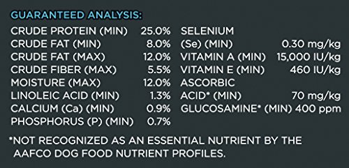 Guaranteed AnalysisCrude Protein (Min)...25.0%, Crude Fat (Min)...8.0%, Crude Fat (Max)...12.0%, Crude Fiber (Max)...5.5%, Moisture (Max)...12.0%, Linoleic Acid (Min)...1.3%, Calcium (Ca)(Min)...0.9%, Phosphorus (P)(Min)...0.7%, Selenium (Se)(Min)...0.30mg/kg, Vitamin A (Min)...15,000 IU/kg, Vitamin E (Min)...460 IU/kg, Ascorbic Acid* (Min)...70mg/kg, Glucosamine* (Min)...400 ppm. *Not recognized as an essential nutrient by the AAFCO Dog Food Nutrient Profiles.