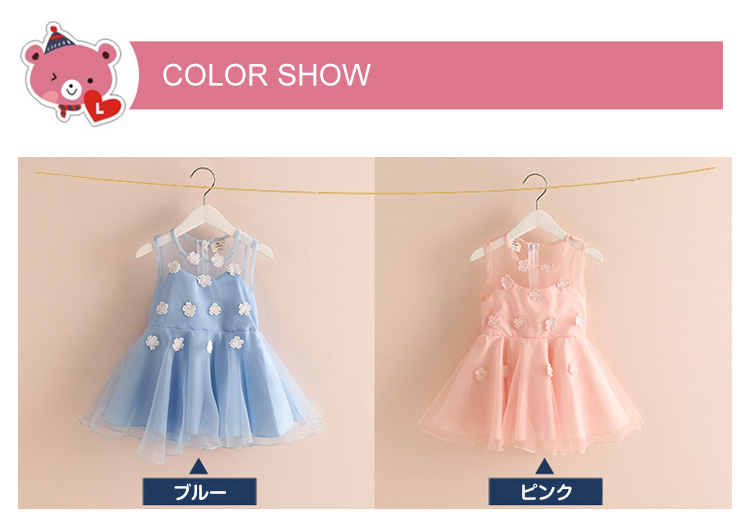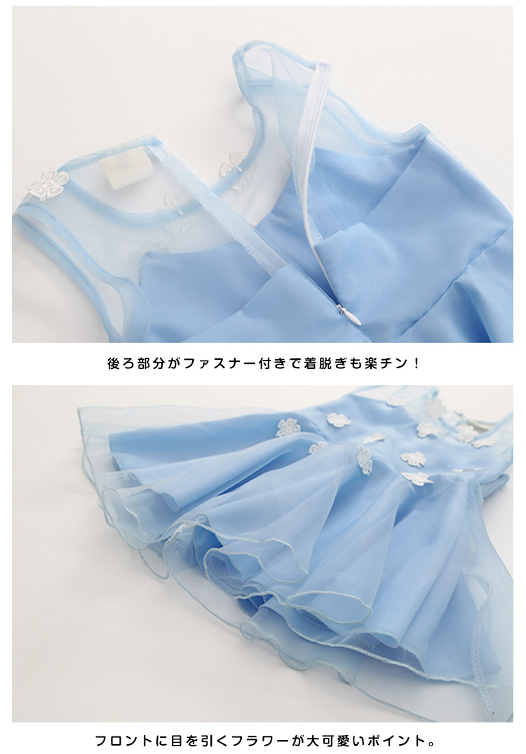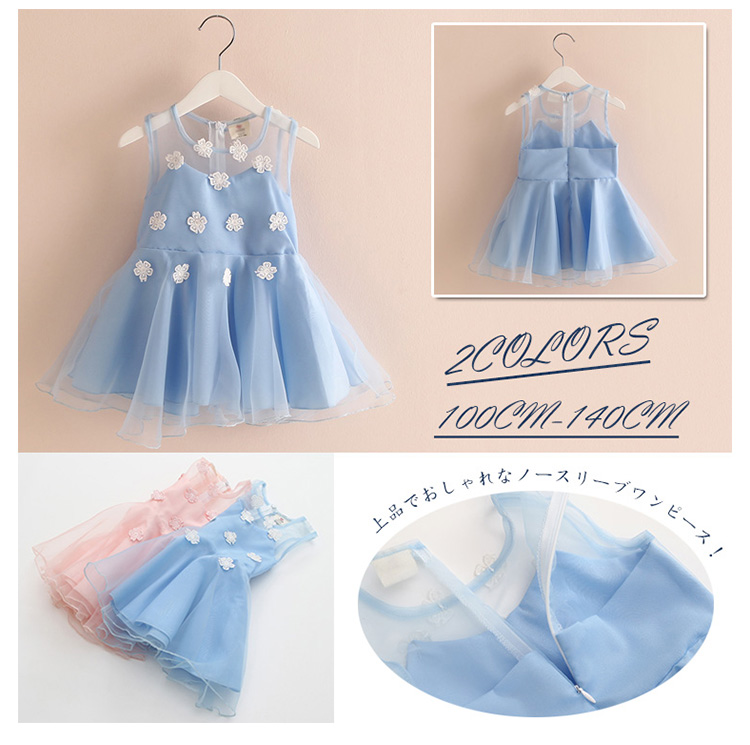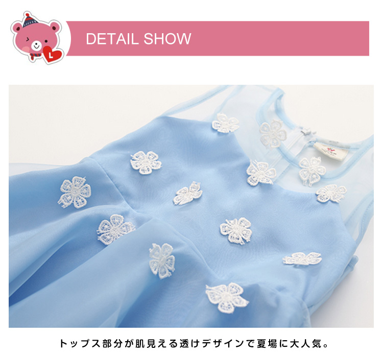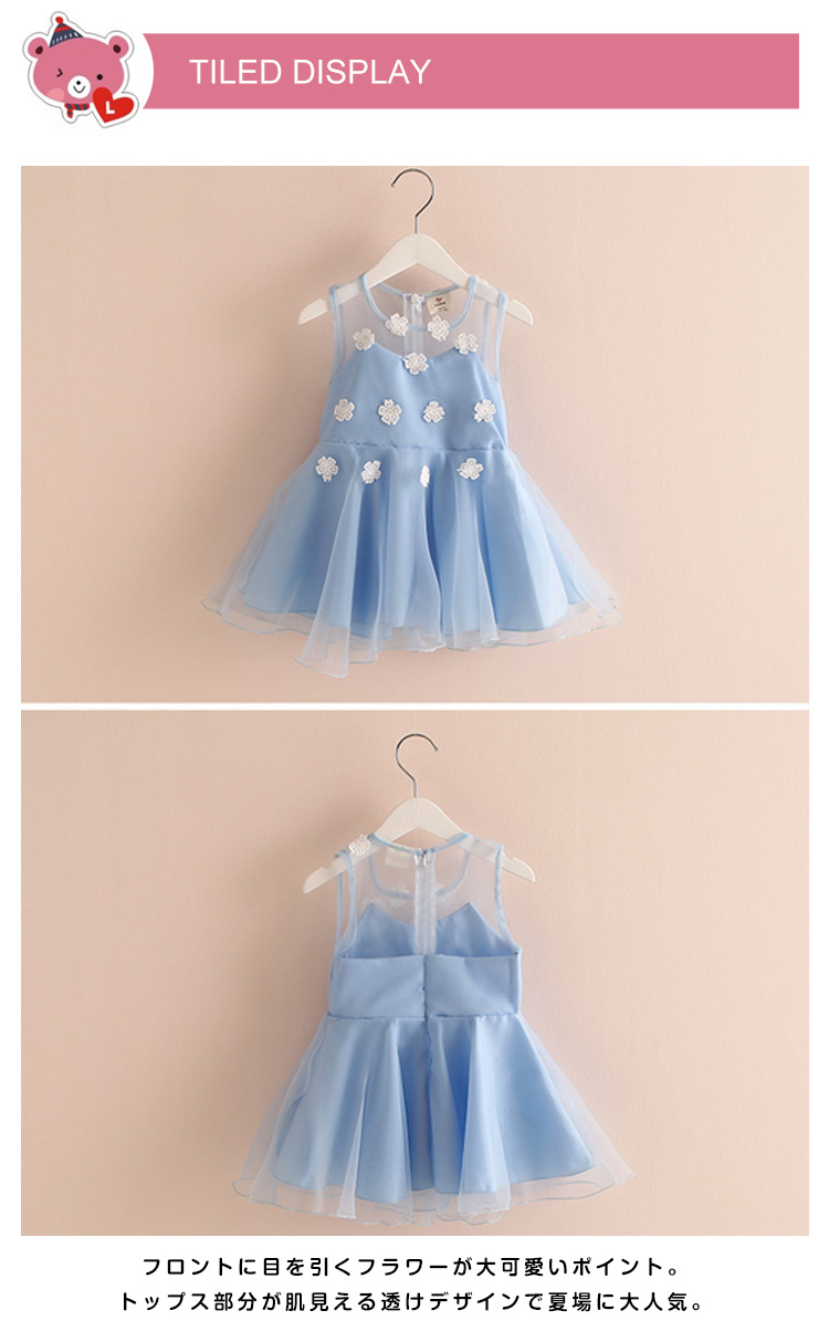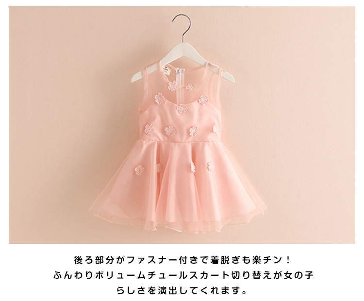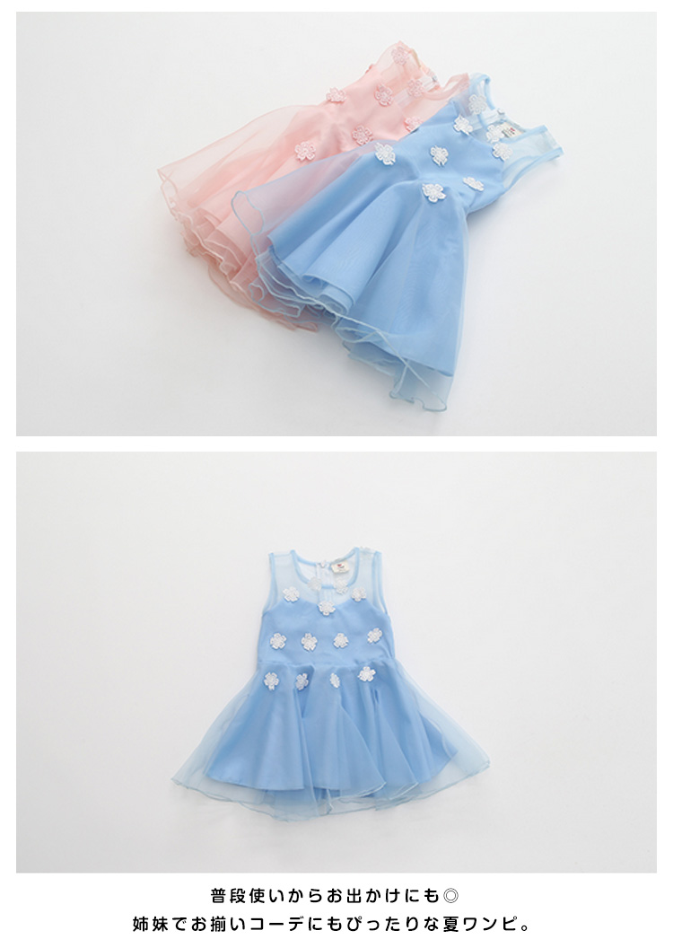 | 上品でおしゃれなノースリーブワンピース!フロントに目を引くフラワーが大可愛いポイント。トップス部分が肌見える透けデザインで夏場に大人気。後ろ部分がファスナー付きで着脱ぎも楽チン!ふんわりボリュームチュールスカート切り替えが女の子らしさを演出してくれます。普段使いからお出かけにも◎姉妹でお揃いコーデにもぴったりな夏ワンピ。 | |
