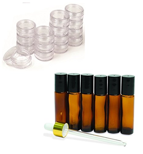 Bahoki Essentials 50 Sets of Clear Plastic Cosmetic Containers With Lids, 5 ml, and 6 pk 10 ml Amber Glass Roll On Bottles with Dropper, - BUNDLE