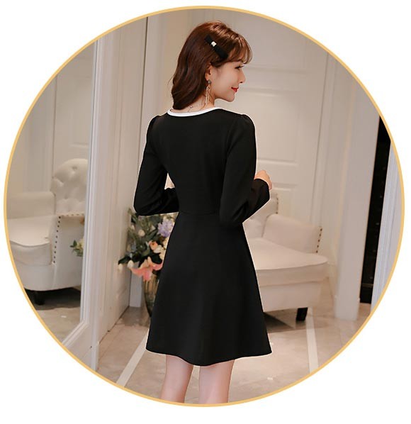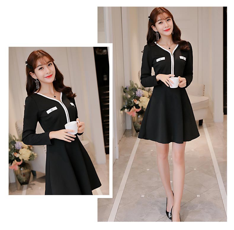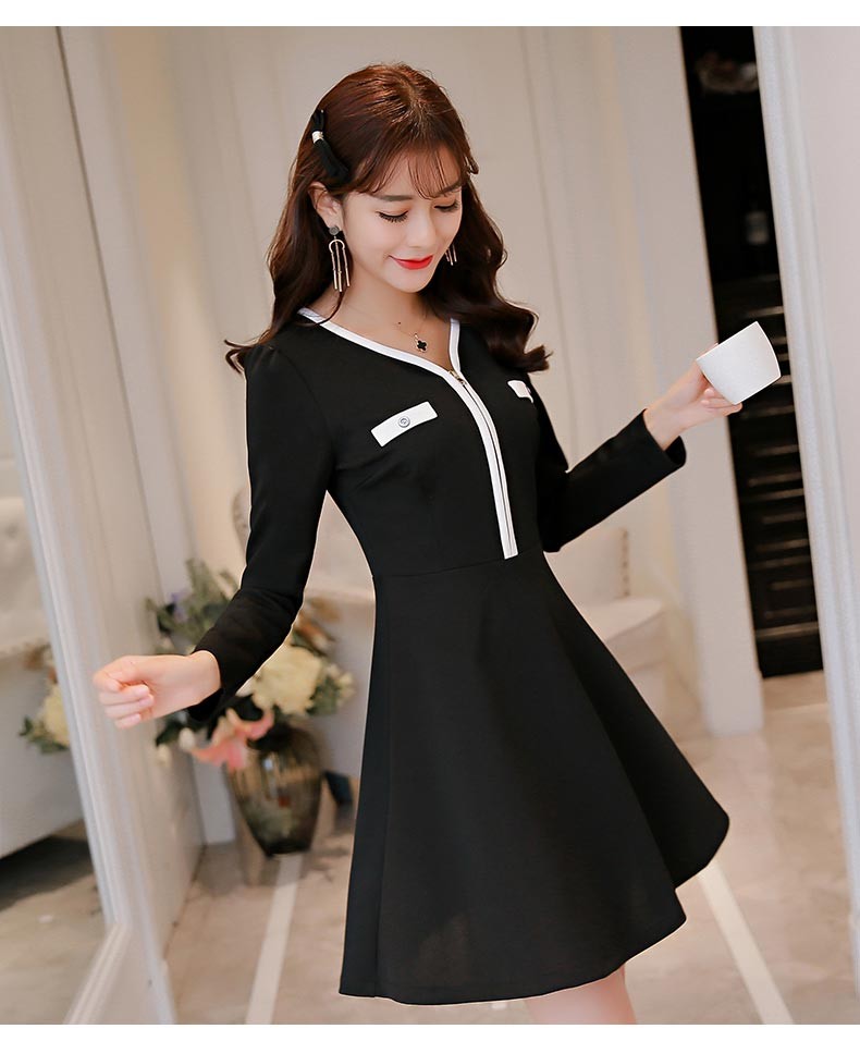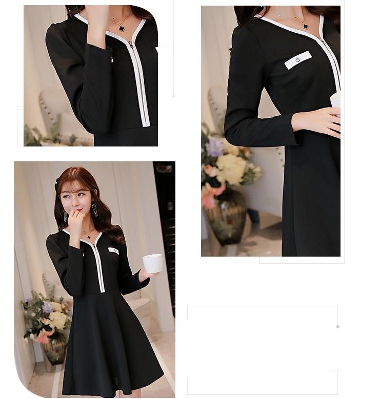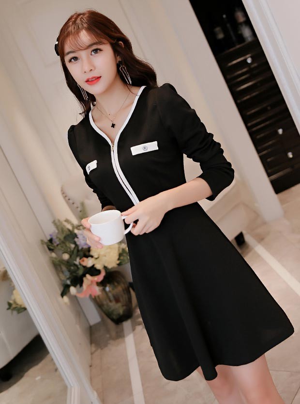 Vネック・長袖・ショート丈・フロントファスナーデザインのブラックワンピース♪