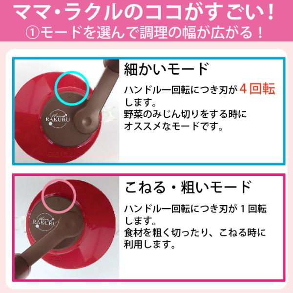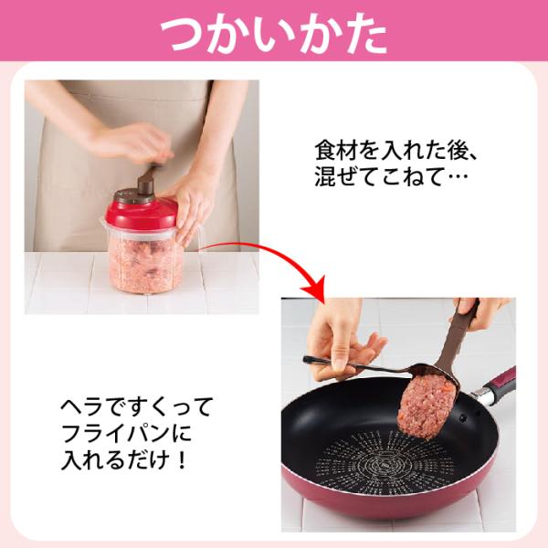 ◆ハンドルを回すだけで、きざむ、まぜる・こねる、落とし込む、レンジで蒸すの4つができる!