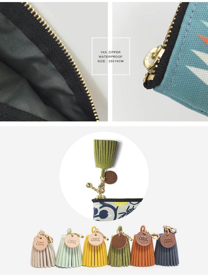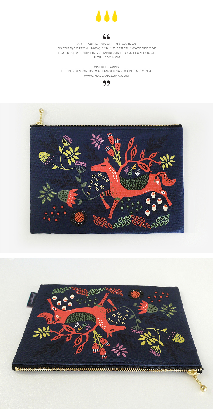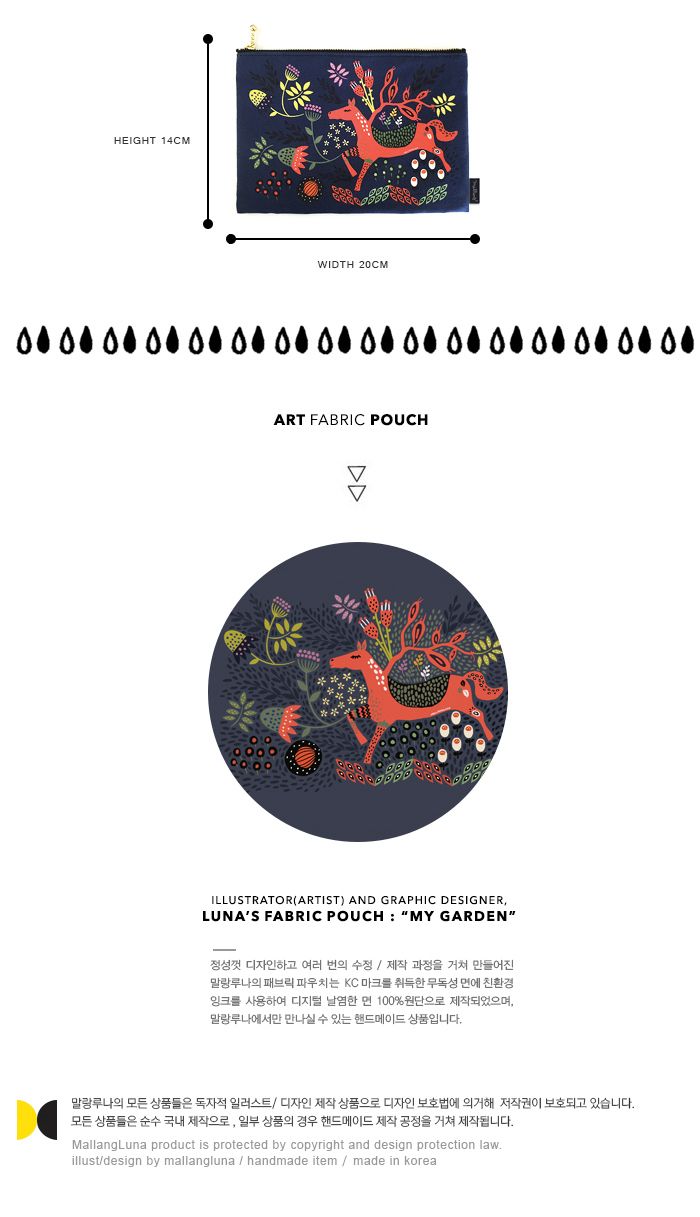 | "마이 가든(나의 정원)'은 빨간 말이 등장하는 꿈 속 이야기를 모티브로 색채를 명암과 음영에 상관없이 평면적으로 배열하고, 2차원의 회화에서도 음악적 리듬감과 흐름을 느낄 수 있도록 구성하여 유니크함을 더 해준 말랑루나에서만 만나보실 수 있는 아트 상품입니다. 겉감은 도톰한 고급 옥스포드 소재(Cotton 100%)로 도톰하고 힘 있는 터치감을 느끼실 수 있구요, 안감은 방수(waterproof) 소재로 생활 이염이 적어, 깨끗하게 사용하실 수 있습니다. 그리고 높은 품질의 YKK 정품 지퍼로 튼튼하고 깔끔하게 마무리 하였답니다. 화장품 파우치, 필통, 전자 제품이나 소품등을 담아두기 좋은 사이즈로 다용도 활용이 가능하세요! 포인트 컬러의 태슬과 함께하면 더욱 빛나는 말랑루나 파우치! 옵션으로 태슬 선택 가능하시구요, 6가지 다양한 컬러의 말랑루나 태슬이 준비되어 있으니, 컬러 선택하셔서 예쁘게 활용하세요! ** 태슬 컬러 ** Cotton Beige [코튼베이지] / Smoothie Mint [스무디민트] / Blossom Yellow [블라썸옐로우] Grass Green [그레스그린] / SunSet Orange [선셋오렌지] / River Gray [리버그레이] 유니크 아이템, "말랑루나 아트 패브릭 파우치"로 특별하고 즐거운 일상을 경험하세요! * Description * - Artist : Luna - Design by MallangLuna / Handmade item - Materials: Cotton 100%(OXFORD) / Waterproof(안감:방수원단) / YKK Zipper / 태슬[별도구매 - 옵션선택] - Size: 20cm * 14cm(가로*세로) - Care instructions : Hand Wash only.(단독 손세탁 권해드려요!) - Origin : Korea --------------------------------------------------------------------------------------------------------------------------- * Care instructions * 중성세제를 사용한 단독 손세탁 권해드립니다. 세탁시 사용시 약하게 울코스로 망에 넣어 단독 세탁해주세요. - 세탁 후의 상품 손상은 반품 및 교환이 불가능합니다 - |
