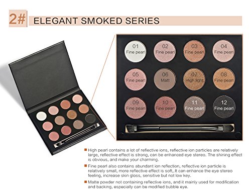 - SMOKY EYESHADOW--Come with 10 fine pearl colors, 1 Highlight colors, 1 Matte color, The eyeshadow makeup palette has so many options to choose from. It is very easy to apply and simple to blend. It comes in a nice slim-fit and compact case. With 12 colors each options include gorgeous shimmering bronzes, eye popping golds and glittery coppers.
