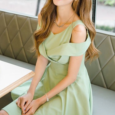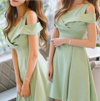 パーティードレス ひざ丈 ワンピース フレア グリーン ショルダー キュート 可愛い 爽やか 上品 大人 セクシー お呼ばれ drgz2617