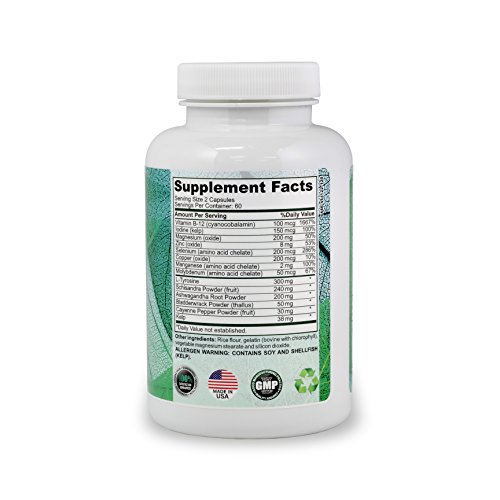 Our formula is Non GMO, Vegetarian Friendly, Gluten Free, Soy Free. We offer the purest, most balanced proven ingredients such as Vitamin B-12, Iodine (kelp), Copper, Magnesium, Manganese, Molybdenum, Selenium, Zinc, L-Tyrosine, Schizandra, Ashwagandha Root, Bladderwrack,, and Cayenne Pepper (herb powders).