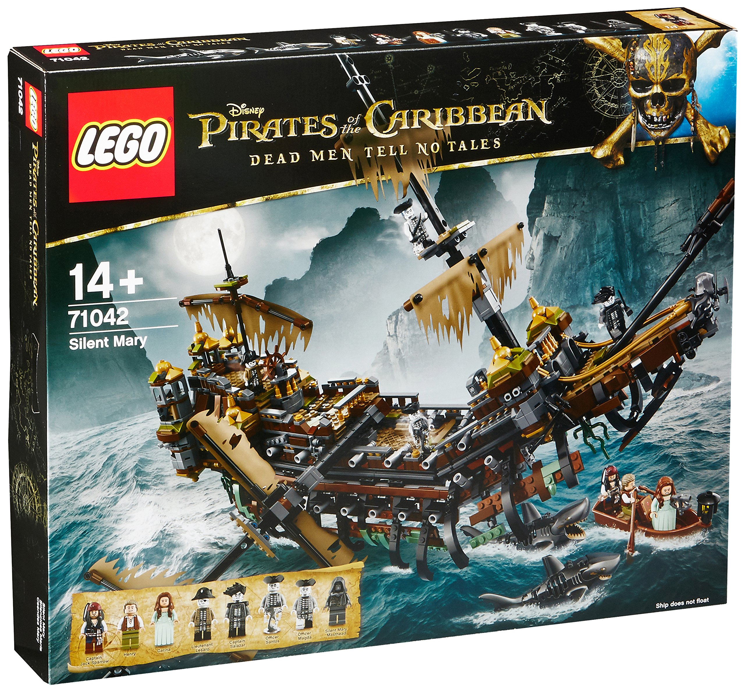 Mini figures Jack Sparrow, Henry, Carina, Captain Salazar, Magda officer, Santos officer, the top of the mast of the Silent Mary, a decayed deck lined with cannons, a snowy fish in battle