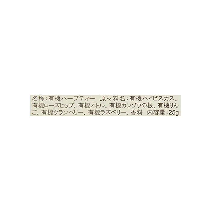 원재료:유기 불상화(Hibiscus),유기 로즈 힙,유기 네《도루》,유기 캔 코끼리의 뿌리,유기 사과,유기 크랜베리,유기《라즈베리》,향료