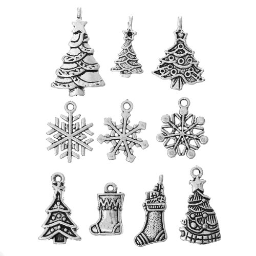 HOUSWEETY 40pcs Mixed Silver Tone Christmas Charms Pendants Snowflakes Trees Jingle Bells Stockings etc