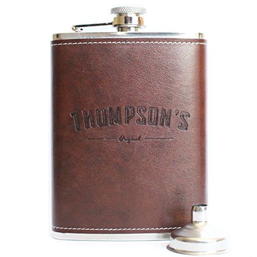 -. Title : Thompson's Leather Flask With Funnel 8oz - Brown Leather Hip Flask, Stainless Steel 8 Ounce Whiskey Flask, Metal Vintage Hip Flask + Funnel - Groomsmen Flask