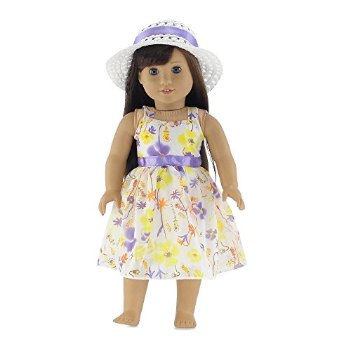 -. Feature : Made to fit 18 Inch dolls such as American Girl, Madame Alexander, Our Generation, Gotz, etc. / This pretty yellow chiffon doll sundress, with yellow, purple and orange flowers, is perfect for an outdoor party with friends! / The lovely tea length party dress has a satiny purple waistband and comes with a white hat with matching purple ribbon. / Designed and manufactured by Emily Rose Doll ClothesTM. Luxurious high quality fabrics, washable, safety tested.
