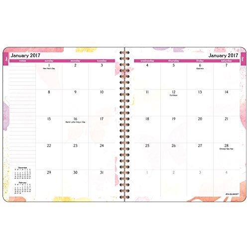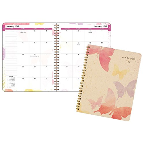 -. Binding : Office Product -. Brand : At-A-Glance -. EAN : 0038576277779 -. Feature : Attractive planner features a beautiful watercolor butterfly design on the cover and pages. 13 month planner includes monthly calendars from January - January for easy event planning all year long. / One month per two page spread with unruled, daily blocks allows free writing. Past and future month calendar blocks are shown on each monthly calendar page for date reference. / Notes space is also included each month for convenient notetaking and to-do lists / Planner features high recycled content: 30% post-consumer waste recycled paper, 30% post-consumer waste recycled cover and 90% post-consumer waste recycled wire / Monthly planner is wirebound with a wire containing 90% post-consumer material. 6.88 in. x 8.75 in. pages. 7.06 in. x 8.75 in. x .37 in. overall size. -. Label : ACCO Brands -. Manufacturer : ACCO Brands -. Model : 791-800G -. MPN : 791-800G -. NumberOfItems : 1 -. PackageQuantity : 1 -. PartNumber : 791-800G -. ProductGroup : Office Product -. ProductTypeName : OFFICE_PRODUCTS -. Publisher : ACCO Brands -. Studio : ACCO Brands -. Title : AT-A-GLANCE Monthly Planner / Appointment Book 2017, 6-7/8 x 8-3/4", Watercolors (791-800G) -. UPC : 038576277779