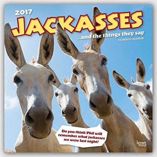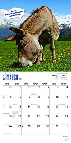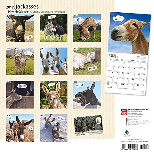 -. Binding : Kitchen -. Brand : Browntrout -. EAN : 0709257561394 -. Feature : 2017 Calendar featuring beautiful full color photographed images for every month of the year. / Includes Holidays and Observances / Perfect for office spaces, bedrooms, classrooms and more! / Makes a great gift for friends and family! / Keep your appointments and Birthdays organized in one place! -. Label : Brown Trout -. Manufacturer : Brown Trout -. MPN : 55101 -. PackageQuantity : 1 -. PartNumber : 55101 -. ProductGroup : Home -. ProductTypeName : HOME -. Publisher : Brown Trout -. Studio : Brown Trout -. Title : Jackasses - 2017 Calendar 12 x 12in -. UPC : 727857238003