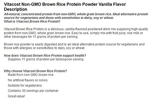 -. Feature : All-natural, concentrated protein from non-GMO, whole grain brown rice. Ideal alternative protein source for vegetarians and those with sensitivities to dairy, soy or wheat / Vitacost Brown Rice Protein is a delicious, vanilla-flavored powdered drink mix supplying high-quality protein from non-GMO, whole grain brown rice. Easy to use, simply mix with fruit juice, rice milk or other beverages for 11 grams of protein per serving / Brown rice powder is easily digested and is an ideal alternative protein source for vegetarians and those with allergies or sensitivities to dairy, soy or wheat.* / No artificial flavors or colors / Contains 30 servings per container