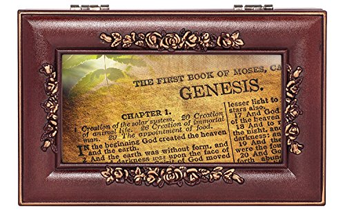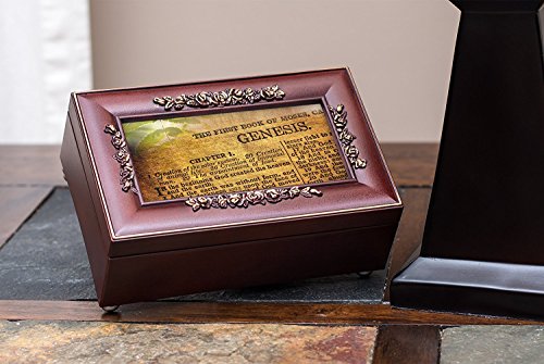 Genesis God Created Heavens Earth Bible Rose Wood Finish Jewelry Music Box Plays Canon in D