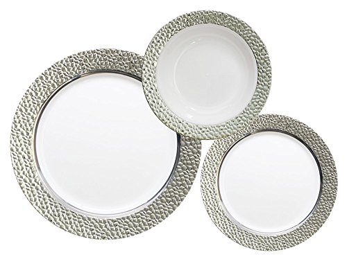 Table To Go 'I Can't Believe Its Plastic' 75 Piece Dinnerware Set, 25 10" Dinner Plates, 25 7.5" Salad Plates and 25 18 oz Bowls, Hammered Design, Color: Silver Ivory