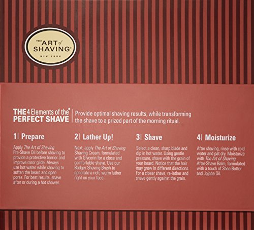 The 4 Elements of The Perfect Shave combine The Art of Shaving's high quality products, handcrafted accessories and expert shaving technique to provide optimal shaving results while helping against ingrown hairs, razor burn, and nicks & cuts. The Full Size Kit offers Pre-Shave Oil (2 fl. oz.), Shaving Cream (5.0 oz.), After-Shave Balm (3.3 fl. oz.), and Pure Badger Shaving Brush made with 100% genuine badger hair.Feature
