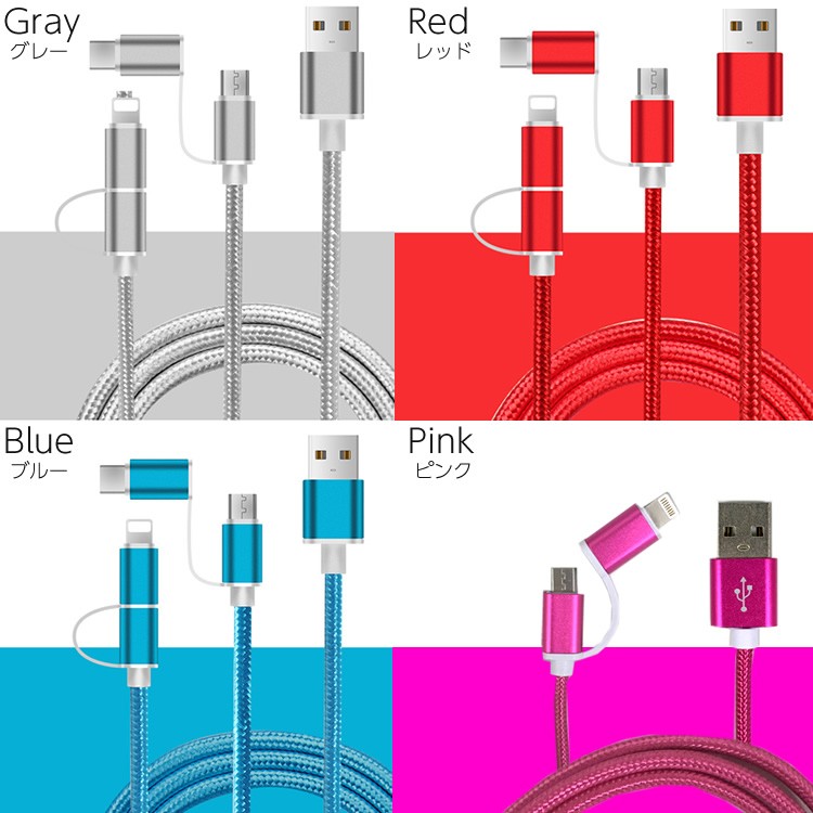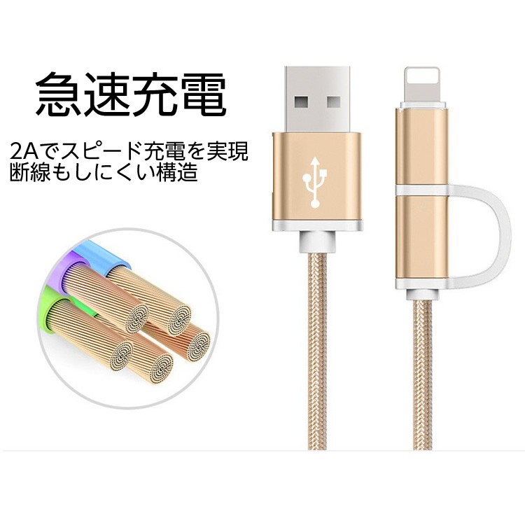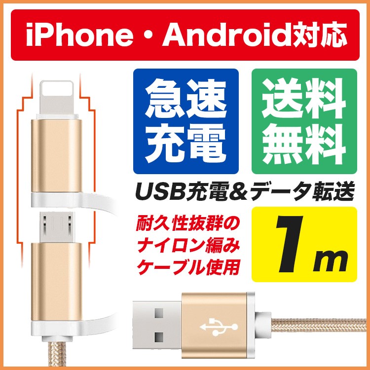 【 2in1 】 iPhone & Android 両対応USB充電・データ転送 合金急速充電ケーブル健康や環境への悪影響がない素材を断熱材として採用しています。優質ナイロンを使用、精密に編み、纏わらない。ケーブルが断線しずらい構造。長さ:1mカラー:ゴールド、ブラック、ピンクゴールド、ホワイトシルバー、グレー、レッド、ブルー、ピンク機種対応:国内キャリア(docomo,au,softbankなど)の、ほとんどのスマートフォンと、iPhoneシリーズ、Androidシリーズも充電できます。