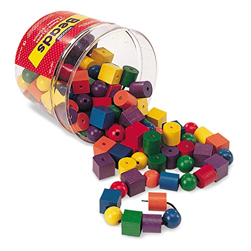 Versatile hardwood beads will have your children counting, sorting, learning colors, practicing patterning, and developing their fine motor skills! Set features 108 beads in six colors, plus two 36" black laces with 1" plastic tips for easy threading. All the beads store neatly in storage bucket when playtime is over.Feature