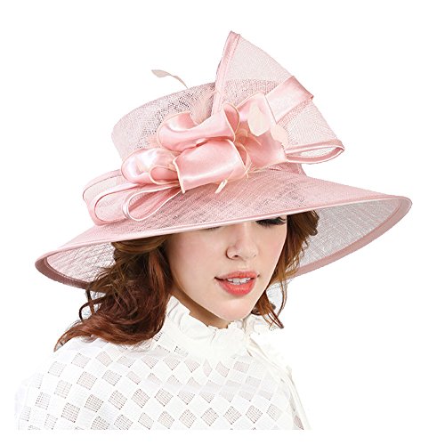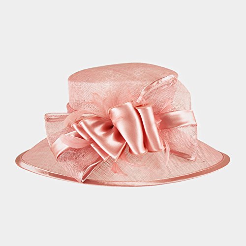 Binding : Apparel Product Description Kentucky Derby Church Wedding Pink Dressy Organza Ribbon Hat 264348 USA SELLER Soft romantic beauty for that special spring/summer event, including the Kentucky Derby! Details ? Color : Peach ? Theme : Bow, Feather ? Crown Circumference : 23" ? Crown Height : 4" ? Brim Width : 5" ? 100% SINAMAY ? Feather Satin Bow Accented Sinamay Hat 0