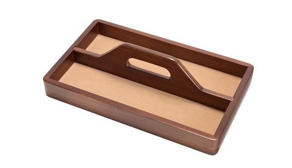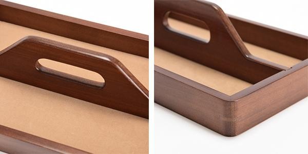 | 日本の職人さんがひとつひとつ丁寧につくった木製のハンドル付きトレーです。角の仕様は、装飾性と強度を保つ「引き込み」仕上げを採用。品のある美しい仕上がりです。 |