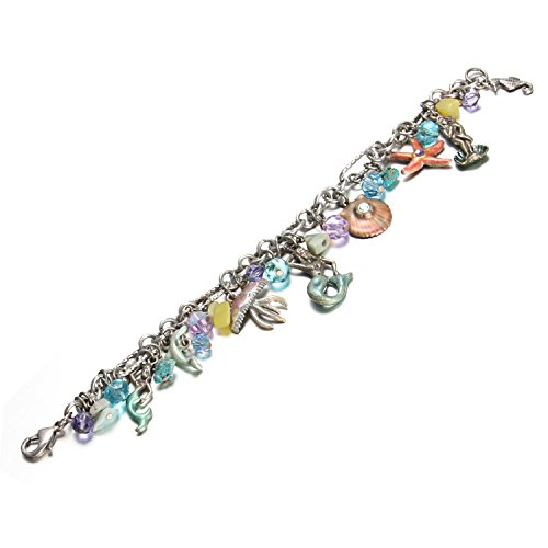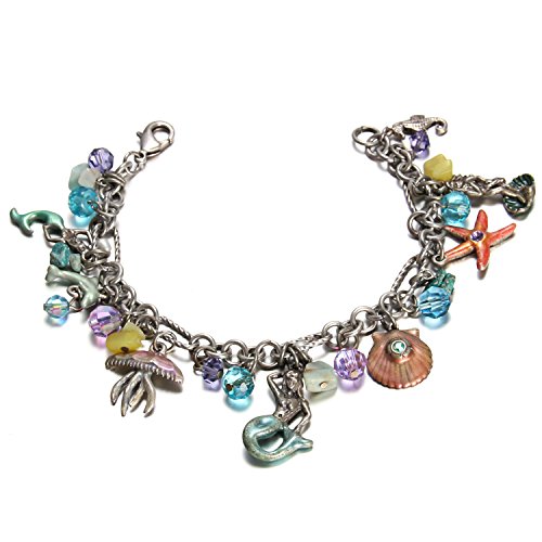 Unlock the magical secrets of the Mermaid! The whimsical "Enchanted Mermaid Green Charm Bracelet" is chock full of hand-enameled charms and accented by luminous crystals and faceted beads in shades of glorious green and plush purple. Inspired by the beauty found in nature, the Mermaid face is cleverly made of lush green starfish and his ancient eyes come to life with glistening violet crystals. Approximate measurements: Bracelet 8" Long. Bracelet can be worn smaller by looping the lobster claw clasp into one of the bracelet links. Charms vary in size from 1/2" long x 1/2" wide to 1-1/4" long x 1" wide. Plated Silvertone.Feature