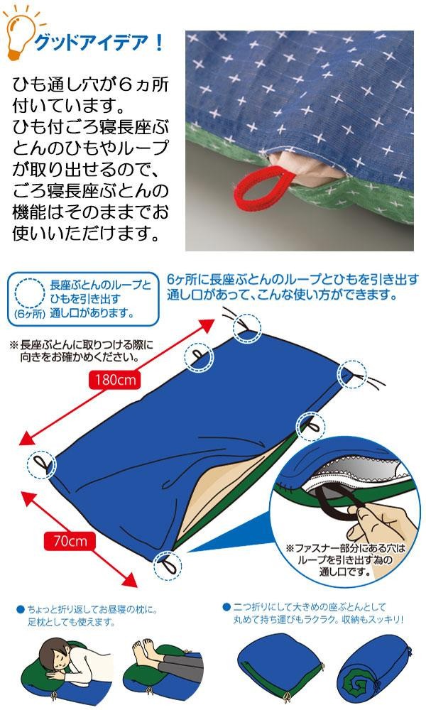ひも通し穴が6ヶ所付いています。ひも付きのごろ寝長座ぶとんのヒモやループが取り出せるので、ごろ寝長座ぶとんの機能はそのままでお使いいただけます。他の長座布団にもお使いいただけます。 |