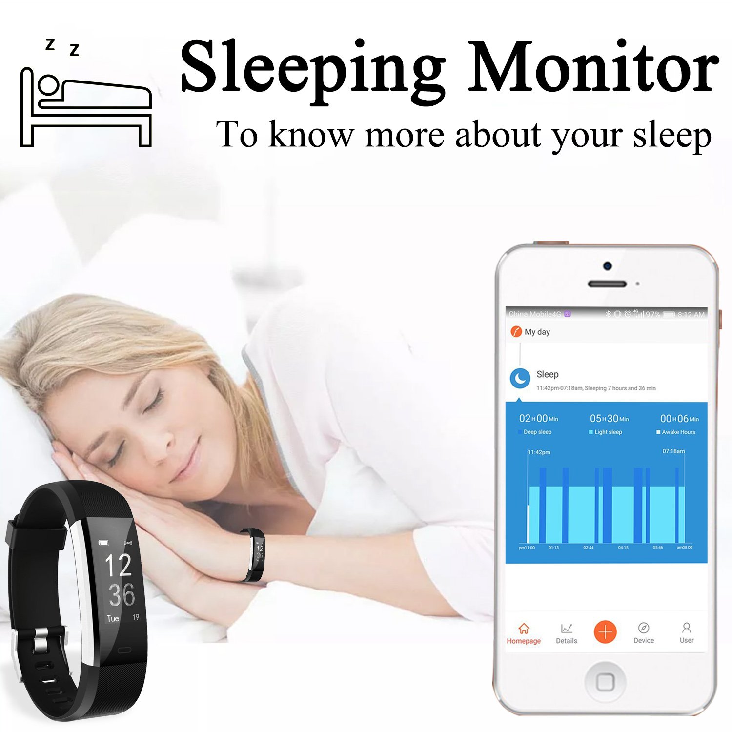 When sleeping, when wearing on the arm, you can measure deep sleep time and shallow sleep time automatically.
