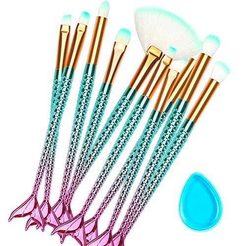 Colorful Makeup Brushes 10+1 Pcs Makeup Brushes Set Silicon Makeup Sponge Mermaid Synthetic Kabuki Foundation Eyebrow Eyeliner Blush Cosmetic...