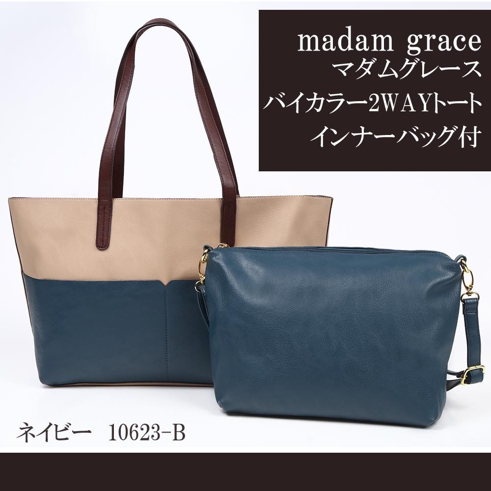 カジュアルだけどエレガントな色合いのバイカラートートバッグです。ショルダーひも付きのインナーバッグもついています♪ 製造国:中国 素材・材質:合成皮革、内面:ポリエステル 商品サイズ:【本体】縦26×横46(底部34)×マチ11cm 重量:710g ※サプライヤー直送品 ご注文後、当日~1営業日後の出荷となります【商品名】madam graceマダムグレース バイカラー2WAYトート(インナーバッグ付) ネイビー 10623-B