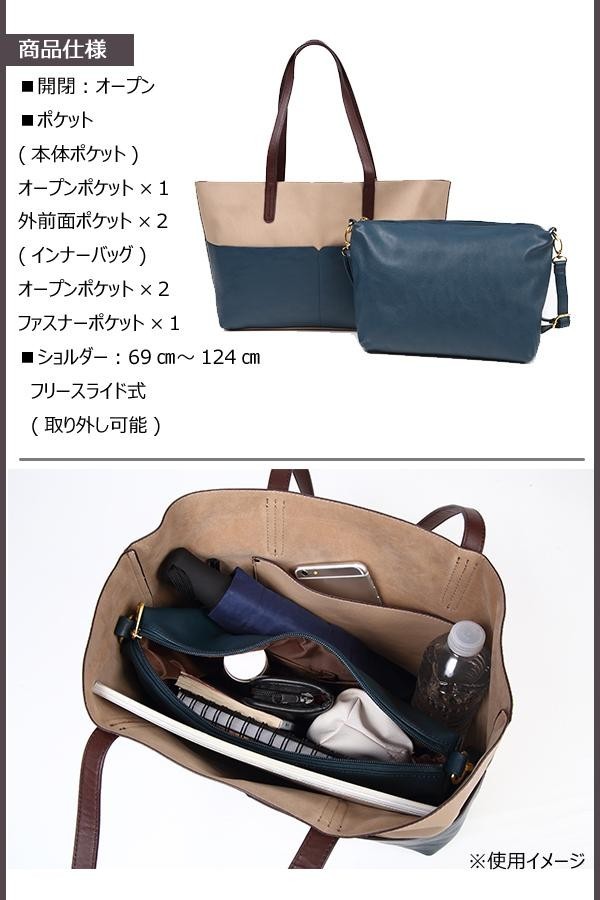 カジュアルだけどエレガントな色合いのバイカラートートバッグです。ショルダーひも付きのインナーバッグもついています♪