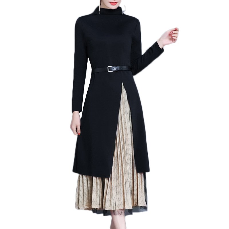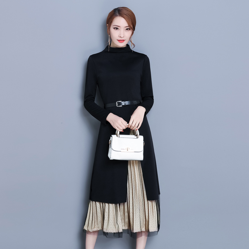 重ね着レイヤード風のクルーネック長袖ワンピース。