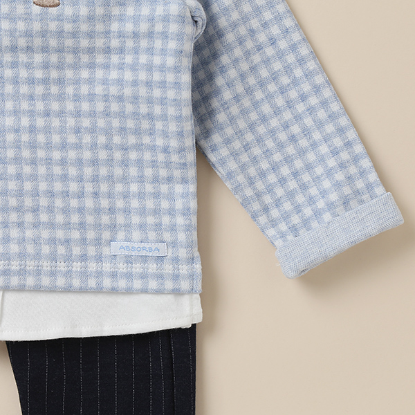 티셔츠는 메란소재의 체크무늬조직으로 고급스러움을 더하였고