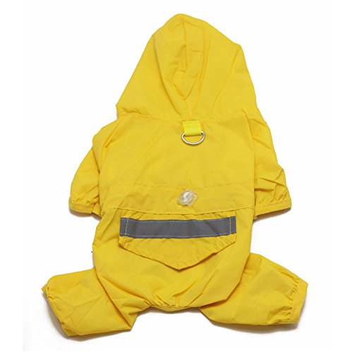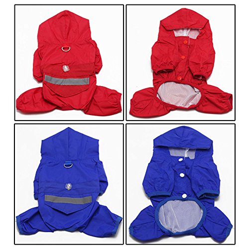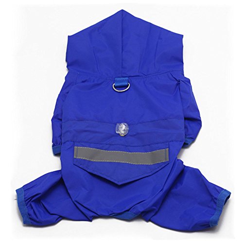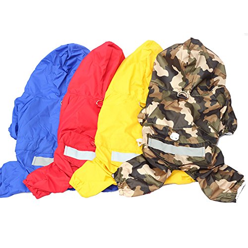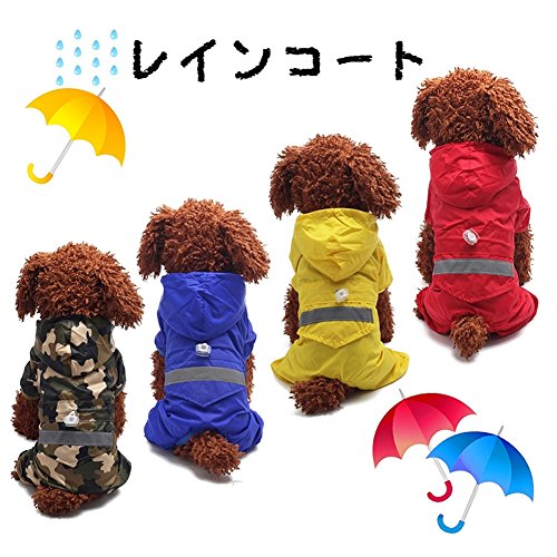 • 反射テープ付き、リード用金具付きの中型、大型犬のレインコートです。 • 足とフードつきで、ワンちゃんを雨からガード。腰回りのしぼり紐はサイズ調整可能でワンちゃんにフィットする作り。裏側がメッシュ素材にしムレにくい工夫をしました。 • フードの下にはリード付けられるフック付きで便利。着脱はスナップボタンで簡単♪スナップボタンがお腹側に付いているので、背中から水が入ってきません。 • 背中には反射テープが付いているので、夜間の散歩でも安心です。小さなポケット付きでとても便利。Feature