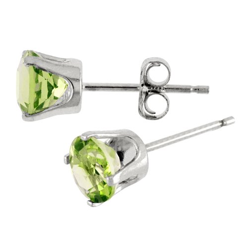 These 14k white gold round peridot stud earrings feature 5 mm genuine natural peridots with a 0.82 ct total weight.