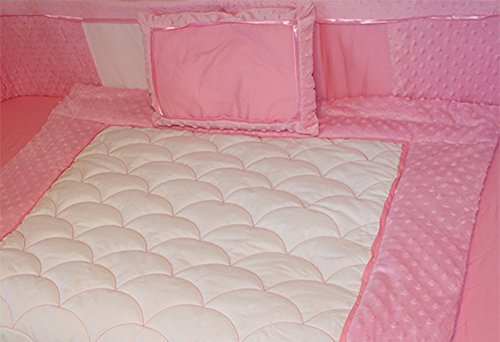 -. Feature : This 10 piece crib bedding set features a beautiful mixture of pink minky dot chenille fabric along with white and pink 100% natural cotton fabrics; this mix of premium fabrics and modern design bring together a style perfect for a baby girl nursery / Included in this 10 piece set are; quilt, bumper, fitted sheet, bed skirt, 2 window valances, toy bag, diaper stacker, decorative pillow and a matching musical mobile / For additional elegance, the quilt features a continuous quilting pattern sewn into the front of the quilt; the border of the quilt is trimmed with 5.5" of ultra soft pink minky fabric; the quilt measures 36" x 45" which allows for several years of use before it is outgrown / The fitted sheet is fully elasticized for a snug fit and fits a standard sized 52" x 28" crib mattress; the fitted sheet is made from 100% cotton providing a gentle fabric next to baby's skin / Care instructions: Machine washable, tumble dry low, iron on low setting as required