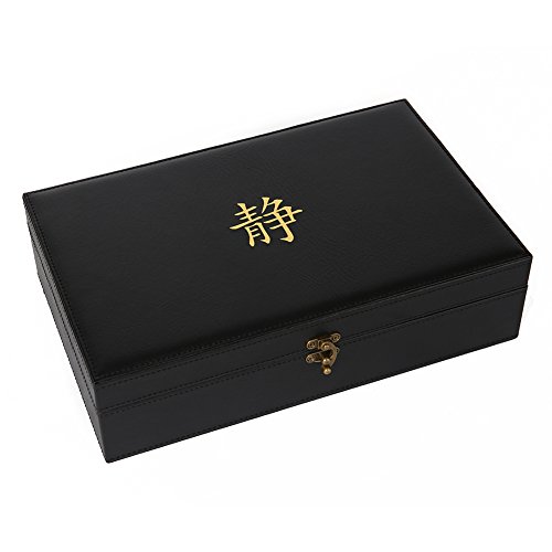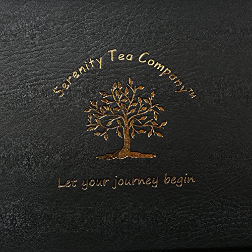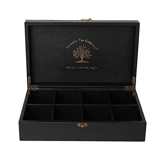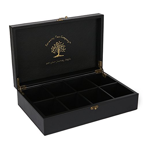 This elegant serenity tea box beautifully stores and preserves your favorite teas. The box is made of high quality, solid hardwood and dark brown leather, which is sure to impress your guests. It comes with exquisite gold embossment of the life tree and lettering "let your journey begin". Each of the 8 equal compartments is large enough to stand your teas either vertically or horizontally with obstructing the closing of the lid. The tea box has a brushed brass latch and newly designed hinges for a more secure open and close. Feel free to take your tea box wherever you may travel. This lid does not allow light to transfer through, so don't worry about your tea getting oxidized. Next time you seek serenity, let your journey begin with your beautiful, handmade serenity tea box.