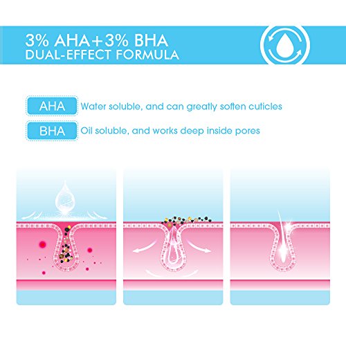 ADVANCED 3% BHA & AHA FORMULA: AHAs work on the skin's surface: they are water soluble and can greatly soften cuticles; BHAs work on both the skin's surface and deep inside pores: they are oil soluble and can help relieve bumps, clear clogs, reduce blemishes, and shrink enlarged pores