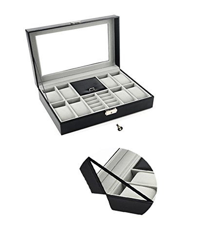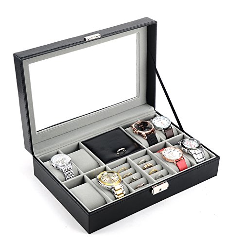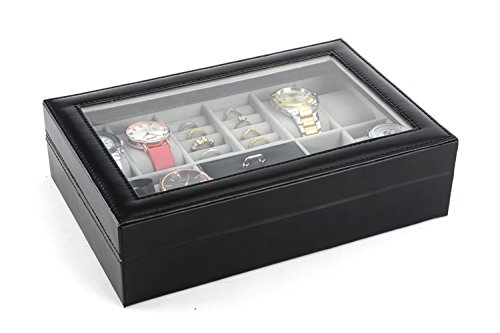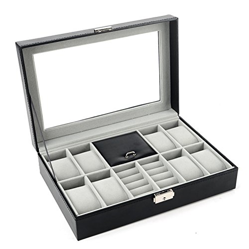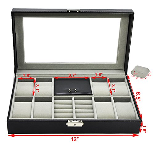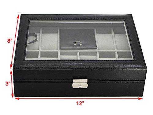 -. Feature : Product Dimensions (L x W x H): 12" x 8" x 3" (30.5 x 20.5 x 8 cm) / Metal Lock,Black High Grade PU Leather surface,velvet interior and pillows,8 removable velvet pillows,2 ring rolls and 1 compartment with a lid on it / Suits for storing watches,jewelry,cuff links,spare links,rings,earrings,bracelets and necklaces / Clear glass top gives you a open view and you can find your favorite treasure in seconds with this unique watch and jewelry box.Perfect for home and business use,and a wonderful gift idea / You will be 100% satisfied with our product!Autoark is so confident you'll love our products,if you're not completely satisfied you'll be offered a prompt refund or replacement,no questions asked
