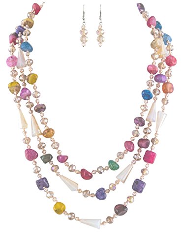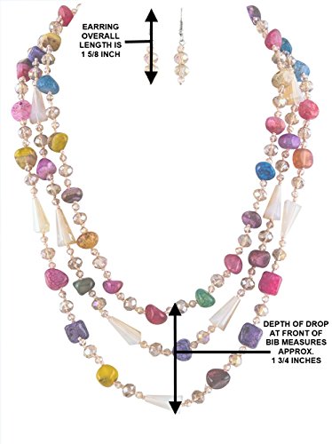 Layered bib 3 strand irisdescent tawny aurora borealis and translucent pink, brown, blue, red and teal color glass and acrylic bead necklace, measuring 19 inches in length, with individually knotted nugget shaped, round, conical and faceted beads.This necklace measures 19 inches in length, with the drop at the front of the necklace measuring approximately 1 ¾ inches (see second photo). This necklace does not have an extender chain.