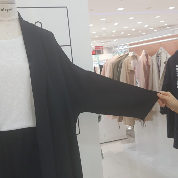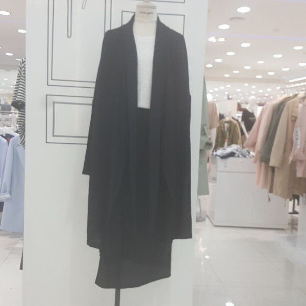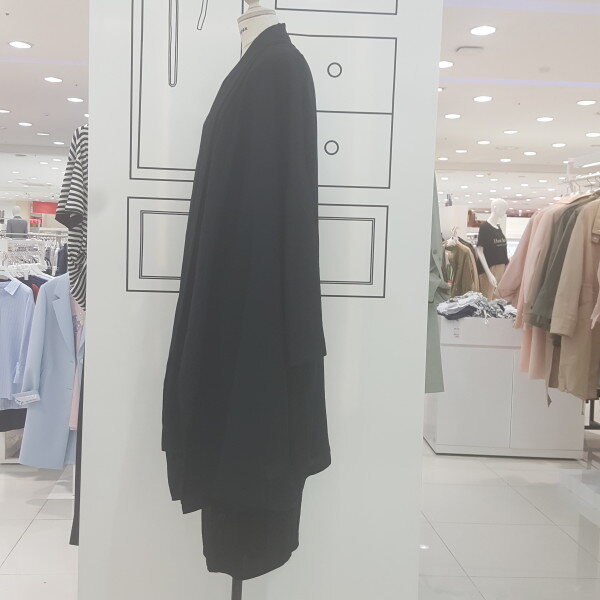 숄처럼 디자인된 가디건이며, 앞쪽에 긴 끈이 리본이나 묶어서 연출되도록 제작된 상품입니다.길이감이나, 소재가 고급스럽고 세련된 아이템입니다.