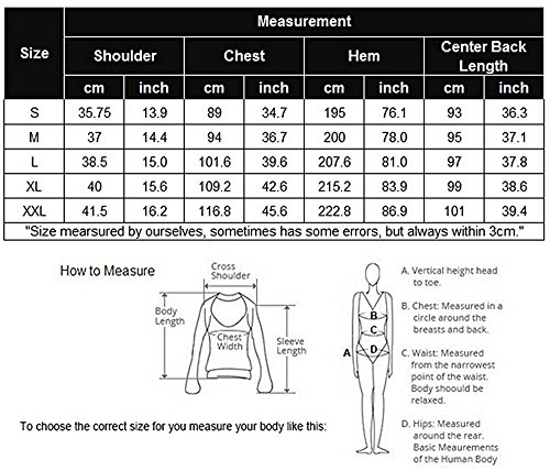 XL---Shoulder40 cm/15.6 inch---Chest109.2 cm/42.6 inch---Hem215.2 cm/83.9 inch---Center Back Length99 cm/38.6 inch