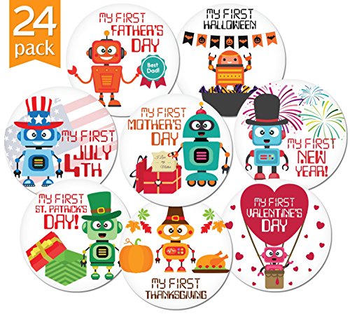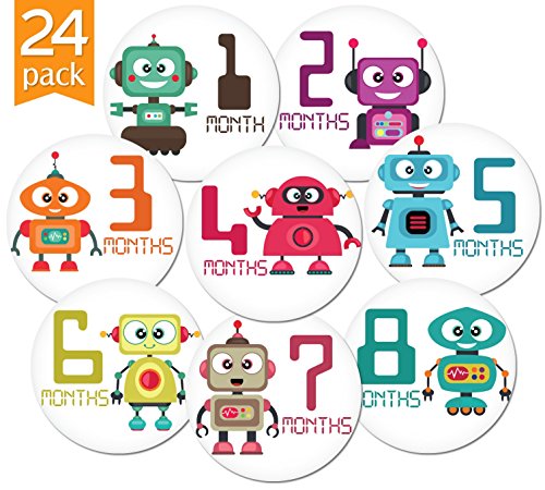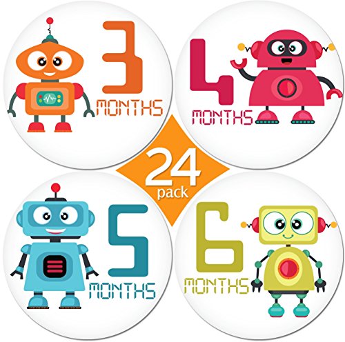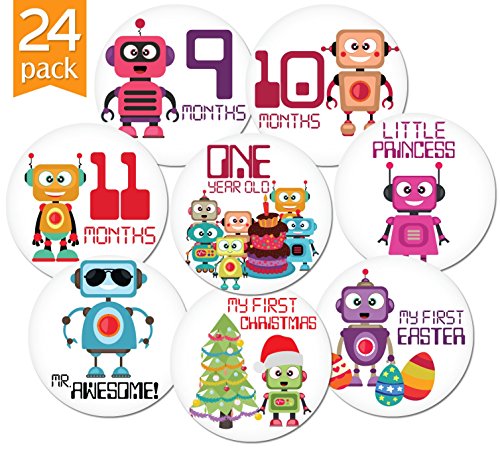 24 Pack of 4" Premium Baby Monthly Stickers By KiddosArt. 1 Happy Robot Sticker Per Month of Your Baby's First Year Growth and Holidays. Month Sticker for...