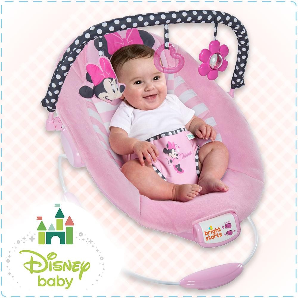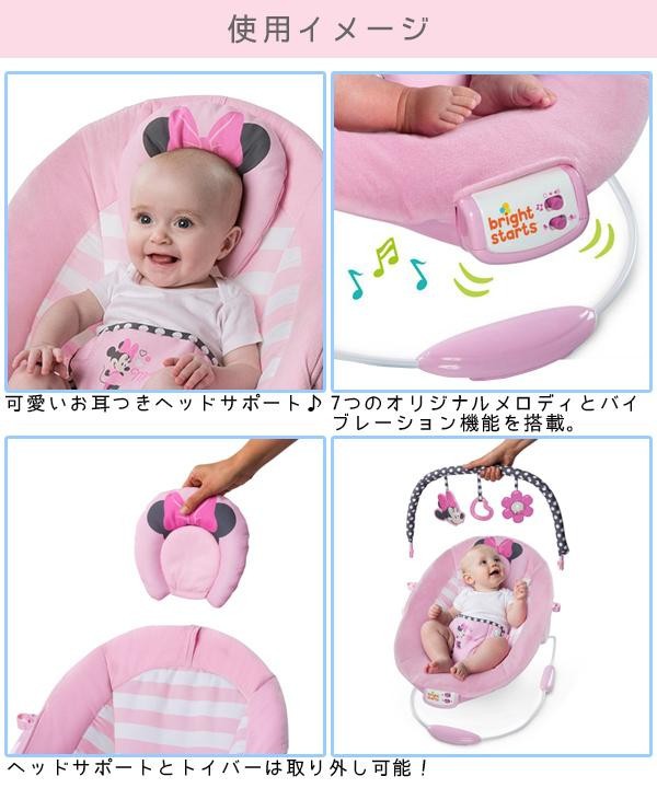 ピンク色の可愛らしい色合いの『ミニーマウス』のバウンサー。7つのオリジナルメロディとバイブレーションを搭載。シートには柔らかな素材を使用しています。トイバーは取り外し可能。 |