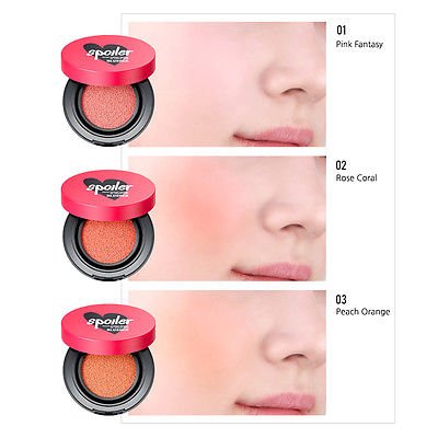 Feature : Spoiler Mini Cushion Blusher Moisture ingredient soft use gives non powdery moisture finish / How to use: Take proper amount, with inserted puff, then tapping gently to apply with apple zone, and naturally make the gradation. / Made in Korea