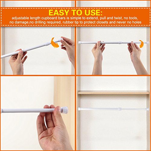 - Easy to use: adjustable cupboard bars tensions rod spring curtain rod is simple to extend, pull and twist, no tools, no damage, no drilling required, rubber tip to protect closets and never no holes